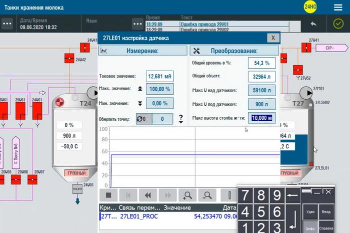The valve distribution cluster is used to connect several departments: 3 milk receiving posts, milk pasteurizer, CIP washing station, mixture storage department. The signal exchange is organized by means of communication via ProfiNET.